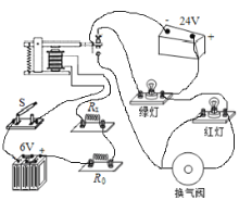 (2)①閉合開關S,因周圍空氣中二氧化碳濃度越大,氣敏電阻越小,當大于10%時,電阻小于某一值,電流大于0.1A,電磁鐵將銜鐵吸下,紅燈亮且換氣扇正常工作,同時綠燈斷開不亮;當周圍空氣中二氧化碳濃度小于10%時,電阻大于某一值,電流小于0.1A,綠燈亮;將控制電路與電源串聯起來;電流小于0.1A時,上觸點與銜鐵接觸,綠燈與電源連接,綠燈亮;電流大于0.1A時,磁鐵將銜鐵吸下,下觸點與銜鐵接觸,上觸點與銜鐵分離,紅燈與換氣扇并聯,紅燈亮且換氣扇正常工作,綠燈斷路;電路連接如下圖所示: