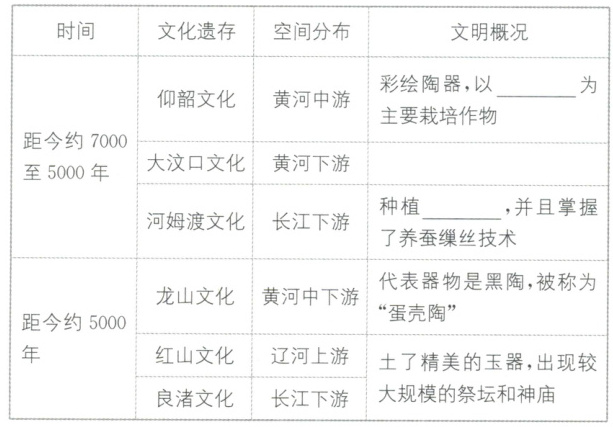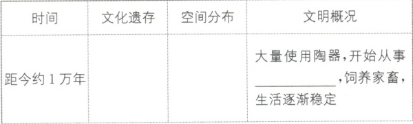 @@| 時間 | 文化遺存 | 空間分布 | 文明概況 || --- | --- | --- | --- || 距今約1萬年 | | | 大量使用陶器,開始從事原始農業,飼養家畜,生活逐漸穩定。 |