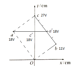 【題目】一勻強電場的方向平行于xoy平面,如圖所示,平面內a、b、c三點的坐標分別為(-48,64)、(48,36)、(0,100),三點的電勢分別為18V,11V,27V。下列說法正確的是